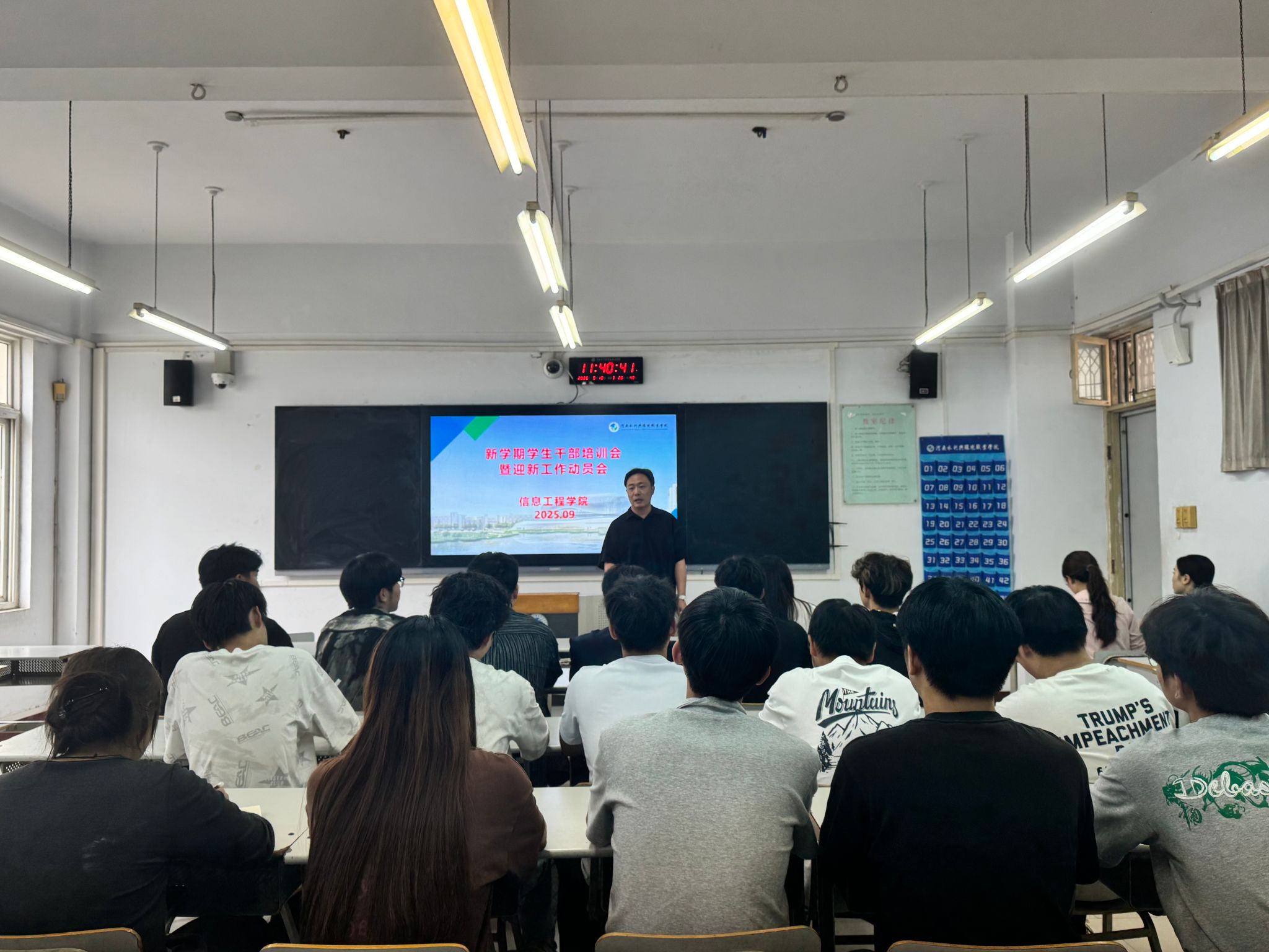 9月10日的学生干部培训会延续服务育人主线,周颖琦向全体学生干部提出“三心”工作准则。其一,以“热心”提服务温度,主动承担秩序引导、行李搬运等迎新实务;其二,以“责任心”守安全底线,将“安全第一”原则贯穿军训组织、夜间查寝等全流程;其三,以“沟通力”增服务效能,通过“一对一”对接精准掌握新生需求。会议特别强调,学生干部需充分发挥桥梁纽带作用,在迎新工作中展现“信息学子”的良好风貌。