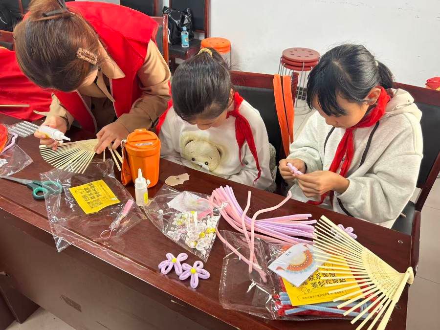 活动首站走进君赵村中心书屋,开启“巧手制扇传京韵” 主题活动。志愿者们先以生动的语言为现场青少年普及重阳节登高、赏菊、敬老等传统习俗,再详细讲解折扇的文化渊源、扇面绘画技巧及折纸塑形要点。随后,在志愿者的一对一指导下,孩子们手持扭扭棒、珍珠、小绒球等材料,一步步完成弯折、扭转、点缀等操作,将京剧头饰元素融入扇面设计,亲手打造出一朵朵灵动别致的 “京韵花朵”。指尖翻飞间,一把把创意十足、饱含童趣的折扇逐渐成型。