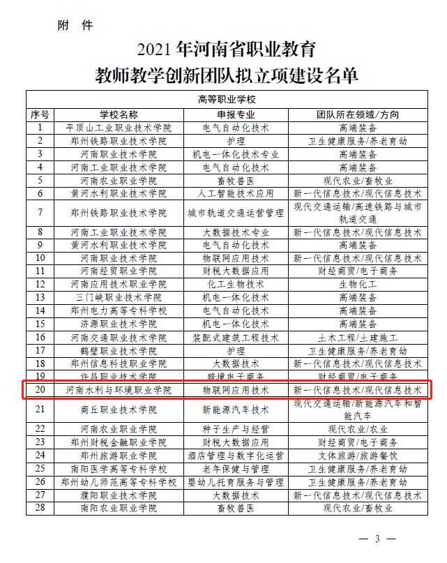 近日,河南省教育厅下发《关于公布2021年河南省职业教育教师教学创新团队立项建设单位名单的通知》(教办职成〔2021〕115号),由副校长张凌杰负责的物联网应用技术团队成功入选。