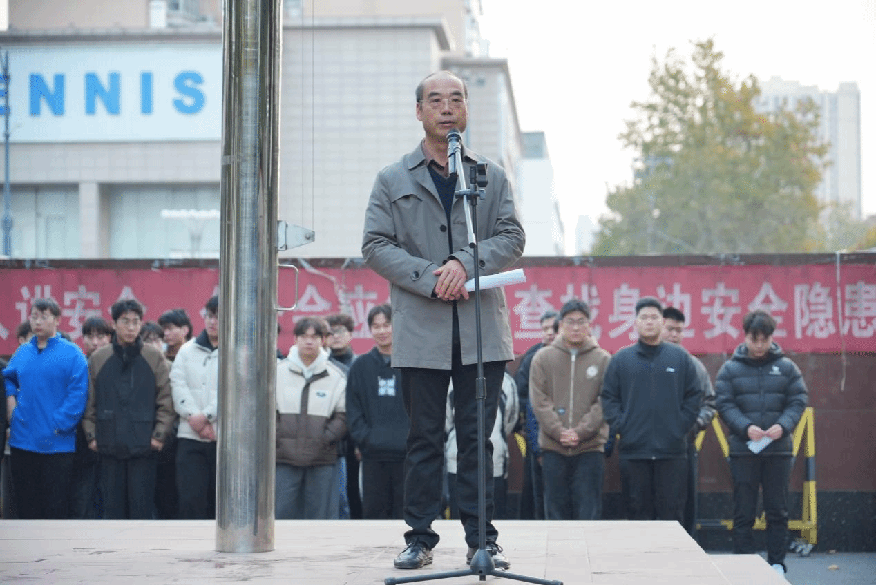 仪式上,学院党总支书记张国路做国旗下讲话,他以“点燃安全红色引擎,筑牢校园一线灯塔”为主题,强调安全是学业发展的基石,并重点围绕消防安全提出要求,一要强化安全防范意识;二要严格执行规章制度;三要发挥榜样作用。同时针对防诈骗、拒暴力、文明出行等六方面安全事项作出提醒,号召全体学生共同维护校园安全,不仅照亮自己的成才之路,也守护身边同学的平安之旅!