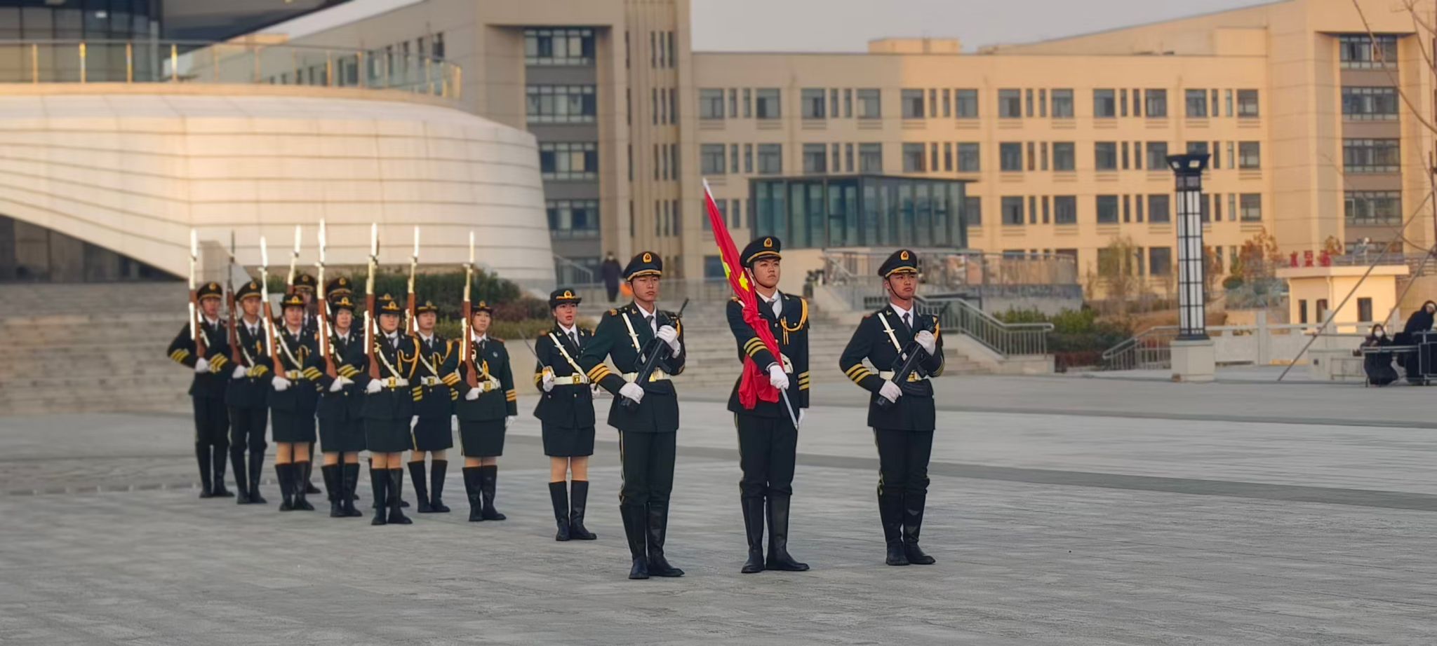 仪式开始,国旗护卫队步伐铿锵,护卫着鲜艳的五星红旗庄严入场。在雄壮的国歌声中,全体师生肃立行注目礼,注视着国旗冉冉升起。